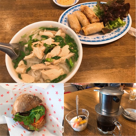 ■鶏肉のフォーとバインミーのセット、さらに揚げ春巻きとベトナムコーヒーを注文。デザートのチェーがセットに付いてきました。