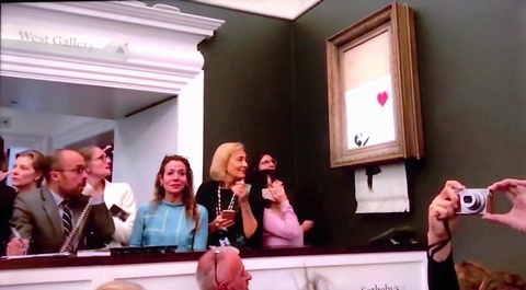 オークションハウス「サザビーズ」で約1億5500万円で落札された瞬間に、額に仕込まれたシュレッダーによってズタズタに切り刻まれるという事件を知っている人も多いかと思いますが、この絵がそのとき落札された絵です。
