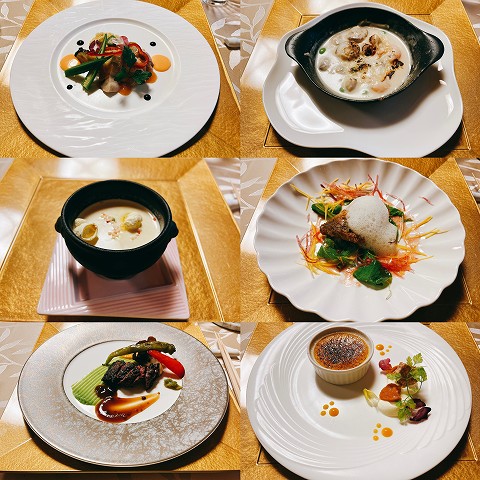 冷たいオードブル、温かいオードブル、スープ、魚、肉、デザートの6品です。