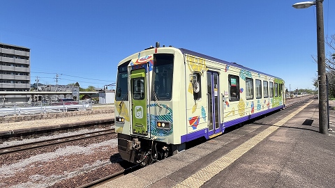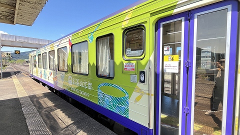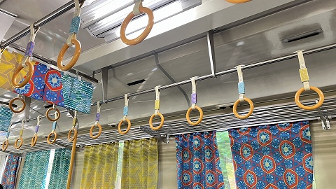 「お茶の京都」の広告列車のようで、ラッピングされ、車内のカーテン、つり革等も統一された柄になっていました。 |
