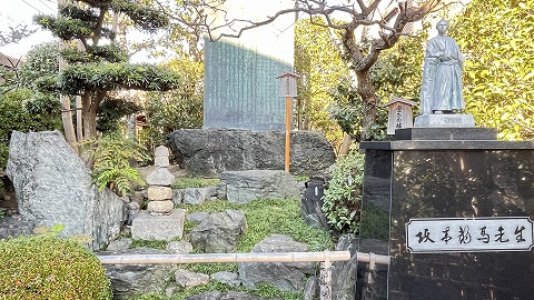 ■当時の建物が建っていた土地に石碑や坂本龍馬像が建っています。