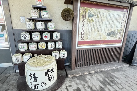 駅前には伏見の酒メーカーのミニ樽が飾ってありました。
