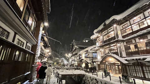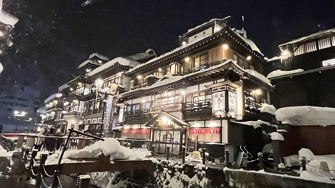 ◆宿に着いたとき、旗を持った団体ツアーや個人旅行のインバウンドの方で温泉街はビックリするほど混雑していました。銀山温泉は10数室の宿しかないこともあり、団体は日帰りです。そのため、夕食後のこの時間になると宿泊客しかいないこともあり静かでした。 |