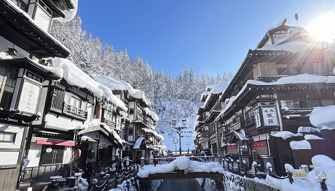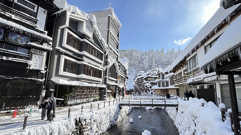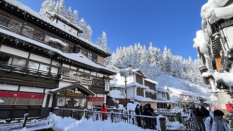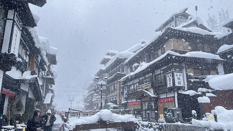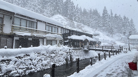 ◆送迎バスが温泉街から徒歩10分ほど離れた姉妹旅館「銀山荘」から出るので、そこまで雪の中を歩いて行きます。 |