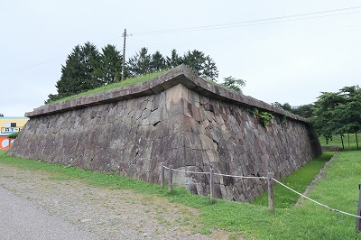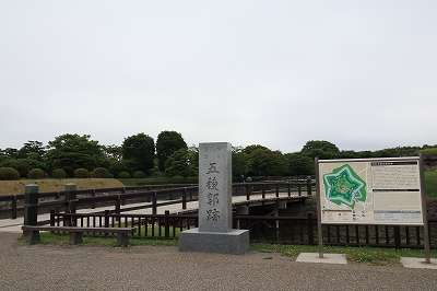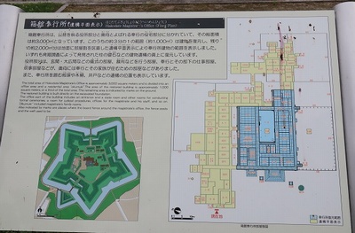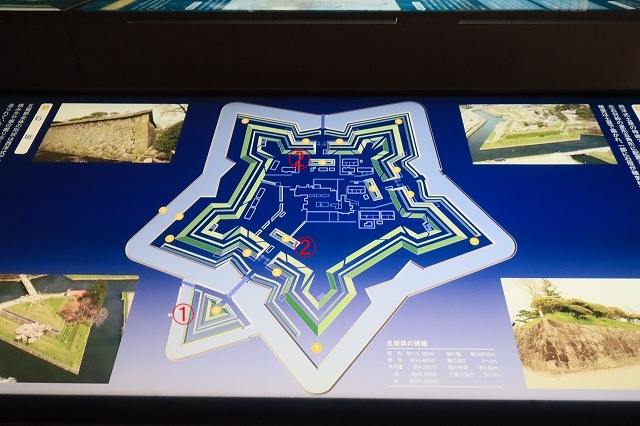 五稜郭は、水堀で囲まれた星型の堡塁(ほうるい)と1ヶ所の半月堡からなり、堡塁には本塁(土塁)が築かれ、その内側に奉行所などの建物が建築された。