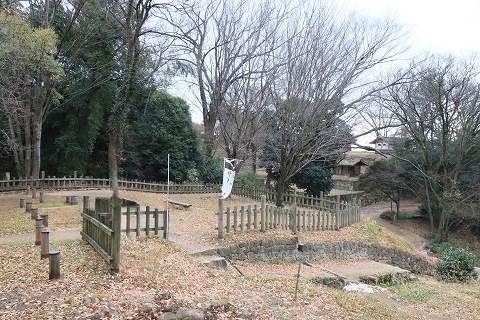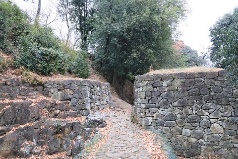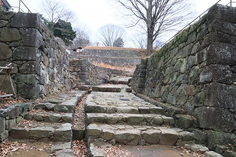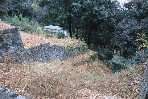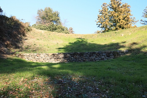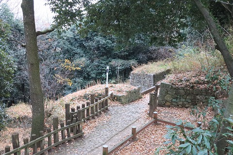 左手の本丸西虎口は礎石が4つあり、その配置から2階建ての高麗門と推測され、復元計画があるそうです。 |