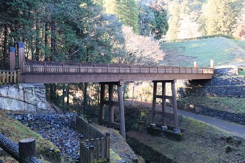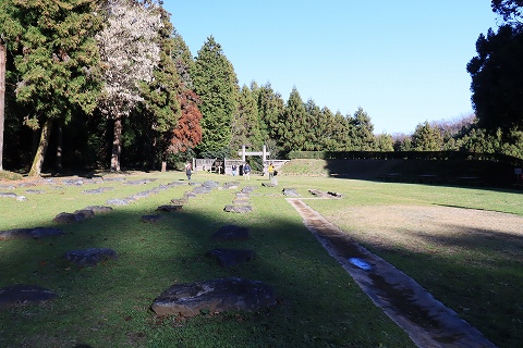 御主殿跡。(居館地区) 出土した遺跡は埋め戻され、位置がわかるように復元整備されています。 向こうに見える門は虎口からの入口で、当時の門をイメージして建てた冠木門(かぶきもん)です。 |