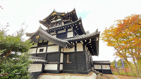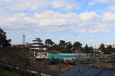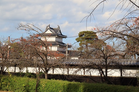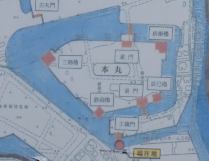 2004年に復元され、最上階の屋根の棟が丁字型で、棟のそれぞれの隅には1匹ずつ、合計3匹の鯱が載る全国唯一の櫓です。しかし、自衛隊の敷地内にあるためこれ以上近づけず、内部も公開されていません。