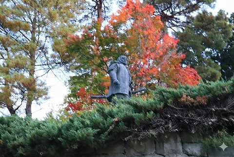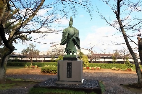 本丸に建つ初代藩主・溝口秀勝の銅像。