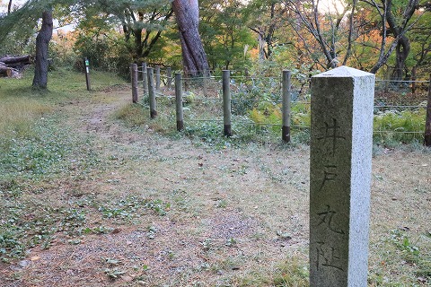 本丸を囲む土塁は、内堀の掘削土を盛り上げて築きました。虎口の切り込みを含めた総延長は1000mになるそうで、このように今でも残っています。