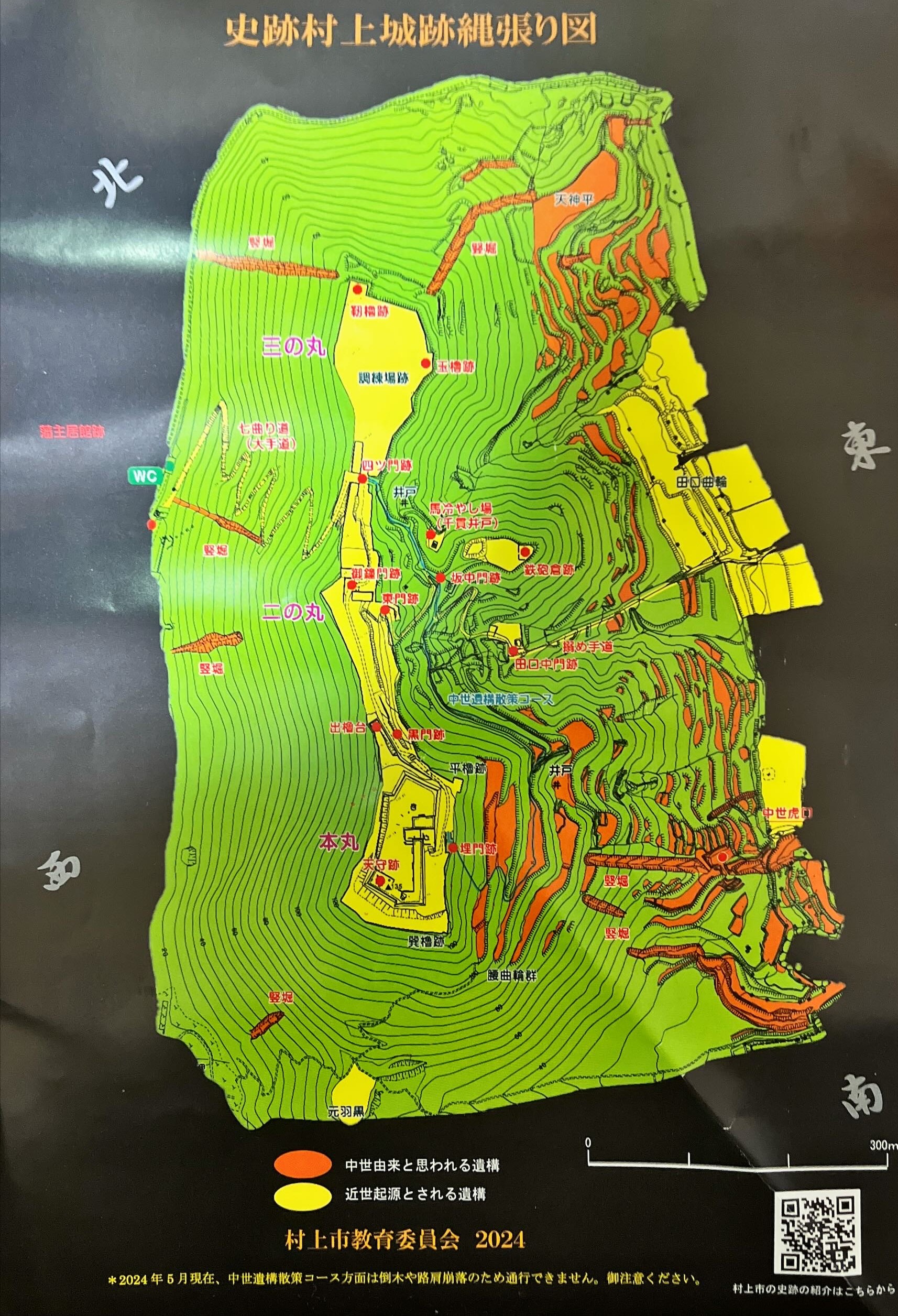 右の写真の黄色部分が近世城郭部、オレンジ色は中世城郭部で、今回歩いたのは近世城郭部のため、説明は近世城郭の遺構となります。