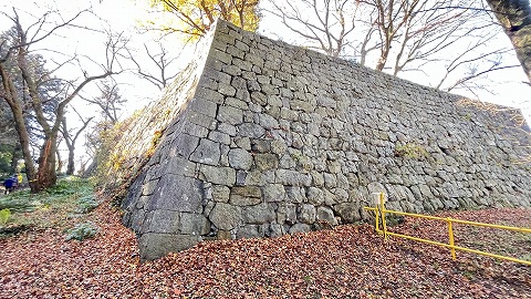 石垣は本丸の表門側のみに用いられ、当初乱積みの石垣が積まれていましたが、1669年の地震で崩れたため、全面的に切込み接ぎ 布積みに積み直されました。