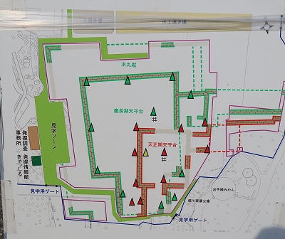 緑のコーン部分は慶長期の石垣で、赤のコーン部分は天正期の石垣。 |