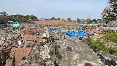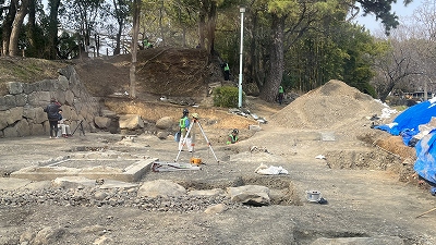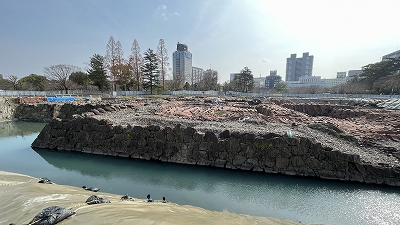 駿河城の天守は1635年に焼失した後は天守台だけが残っていましたが、1896年に天守台は取り壊され、その土砂で本丸堀が埋め立てられました。2016年より地中に埋没している天守台石垣の残存状況などを調べるために「天守台発掘調査」が行われています。 |
