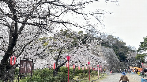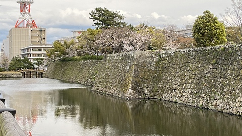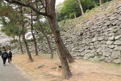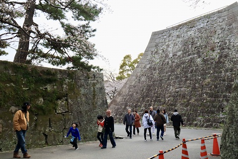 見上げると、左手に松ノ丸西門、そして松ノ丸、鐘ノ丸の石垣が見えます。