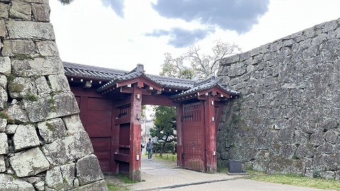 赤門は三位以上の大名家に嫁いだ徳川将軍家の娘の住む御殿の門として建てられますが、和歌山城の場合は二の丸の「御座の間」(藩主の居所)から見たときに裏鬼門(南西)の方角に当たるため、魔除けのために赤く塗られたと推測されています。