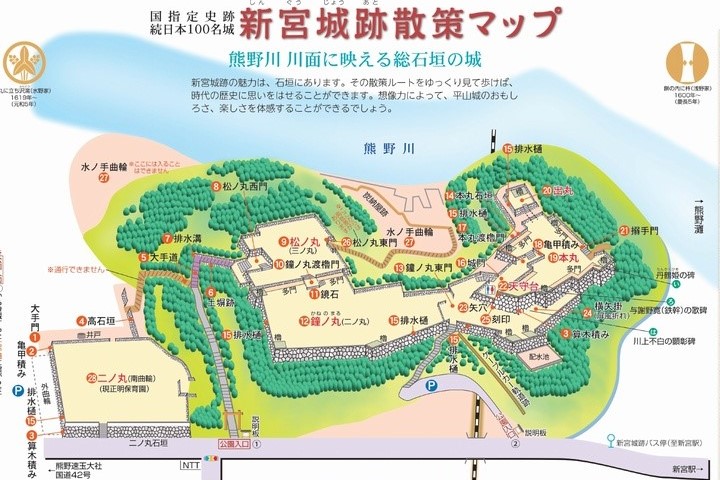 新宮城は、熊野川沿岸の田鶴原(たづはら)と呼ばれたあたりの小高い丘である丹鶴山(たんかくやま)に築かれた平山城で、別名丹鶴城とも呼ばれます。