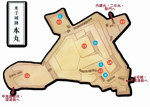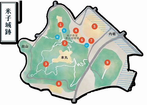 現在の米子城跡図。(マル数字は説明文で使用) 江戸時代に新たに湊山に城が築かれ、山頂の本丸、北側の中腹に二の丸(C)、その下に三の丸(D)を置き、戦国期に米子城の主郭であった飯山は出丸(H)として利用された、梯郭式の平山城です。 |