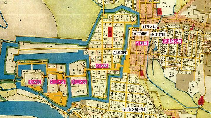 久留米城下町図。(クリックして表示されるPDFでマップを拡大できます) 〜久留米市ホームページより〜 |