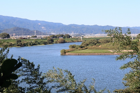 右から流れてきた筑後川が宝満川と合流し、左側(南)へと大きく蛇行します。 |