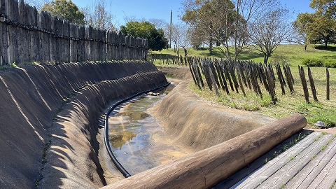 右手は「逆茂木(さかもぎ)」と呼ばれる、先を尖らせた杭や鋭い枝の付いた木を斜めにたくさん立てて、敵の侵入を防ぐものです。