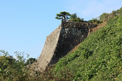傾斜が緩やかな古い石垣(右)に、傾斜が急な新しい石垣が築き足されています。