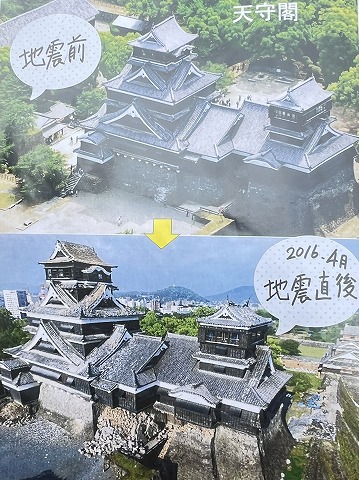 2016年4月の熊本地震の際に、多くの石垣が崩落したほか宇土櫓などの文化財建造物、大小天守などの復元建築が被災し、修復が進められている。復元した天守は2021年に復旧工事が完了したが、全体の完全復旧は当初の計画より15年遅れ、2052年度となる見直しであると発表されている。