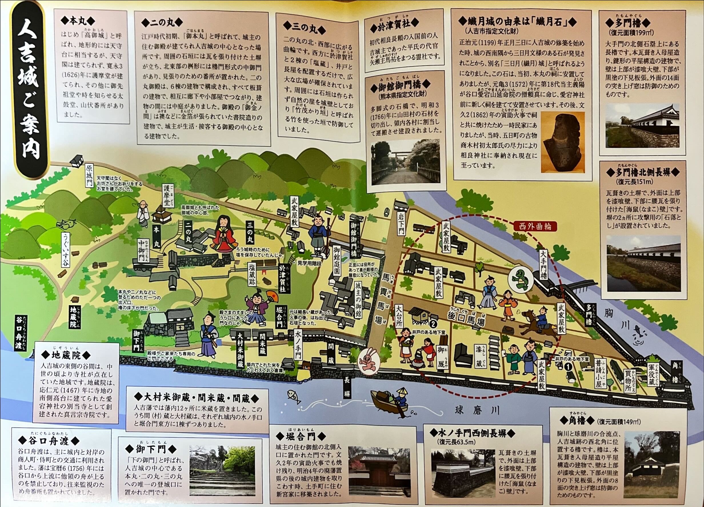 人吉城は球磨川とその支流胸川の合流点の山に築かれており、北側と西側は球磨川と胸川を天然の堀とし、東側と南側は山の斜面と崖を天然の城壁として、巧みに自然を利用している平山城である。