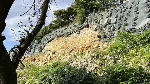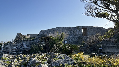 首里城の遺構はほとんど残っておらず、世界遺産に指定されている遺構は本殿の基壇(建物を支える土台)で見ることができません。。 |