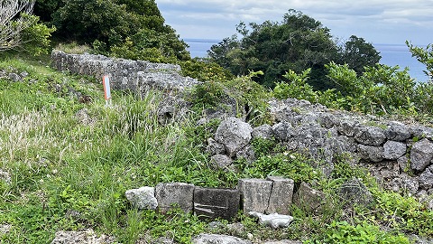 Fの御内原(ウーチバル)から見た大隅。万里の長城のように波打つ石垣が長々と伸びています。曲線の石垣とブルーの海の組合わせがとても美しい眺めです。